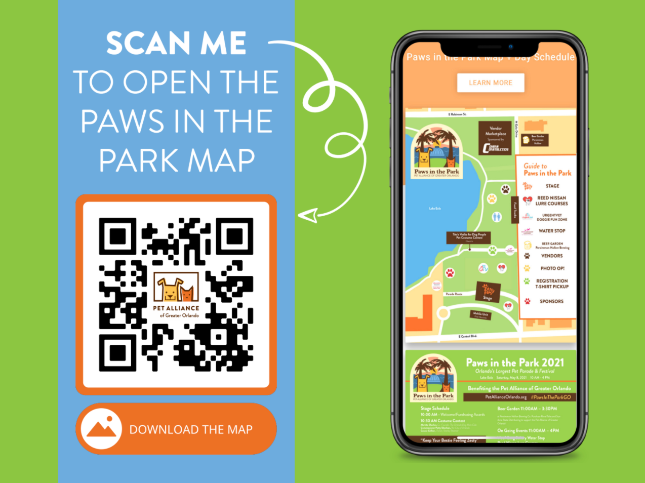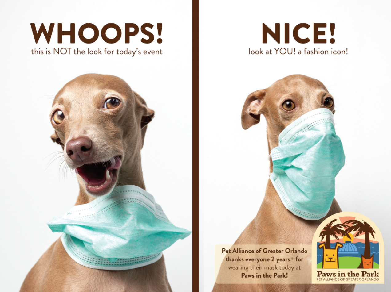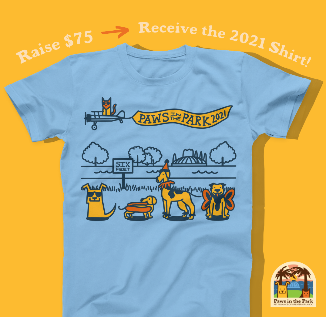 I have had the pleasure of designing print collateral for three Paws in the Park (PITP) events — Pet Alliance's second-largest fundraiser of the year. In 2021, we branched out by creating a new PITP logo and our most ambitious t-shirt design to date. Additionally, I created sharable social graphics as our first ambassador toolkit, created the website through a third-party fundraising platform, as well as new safety signage for COVID-19 compliance with The City of Orlando.