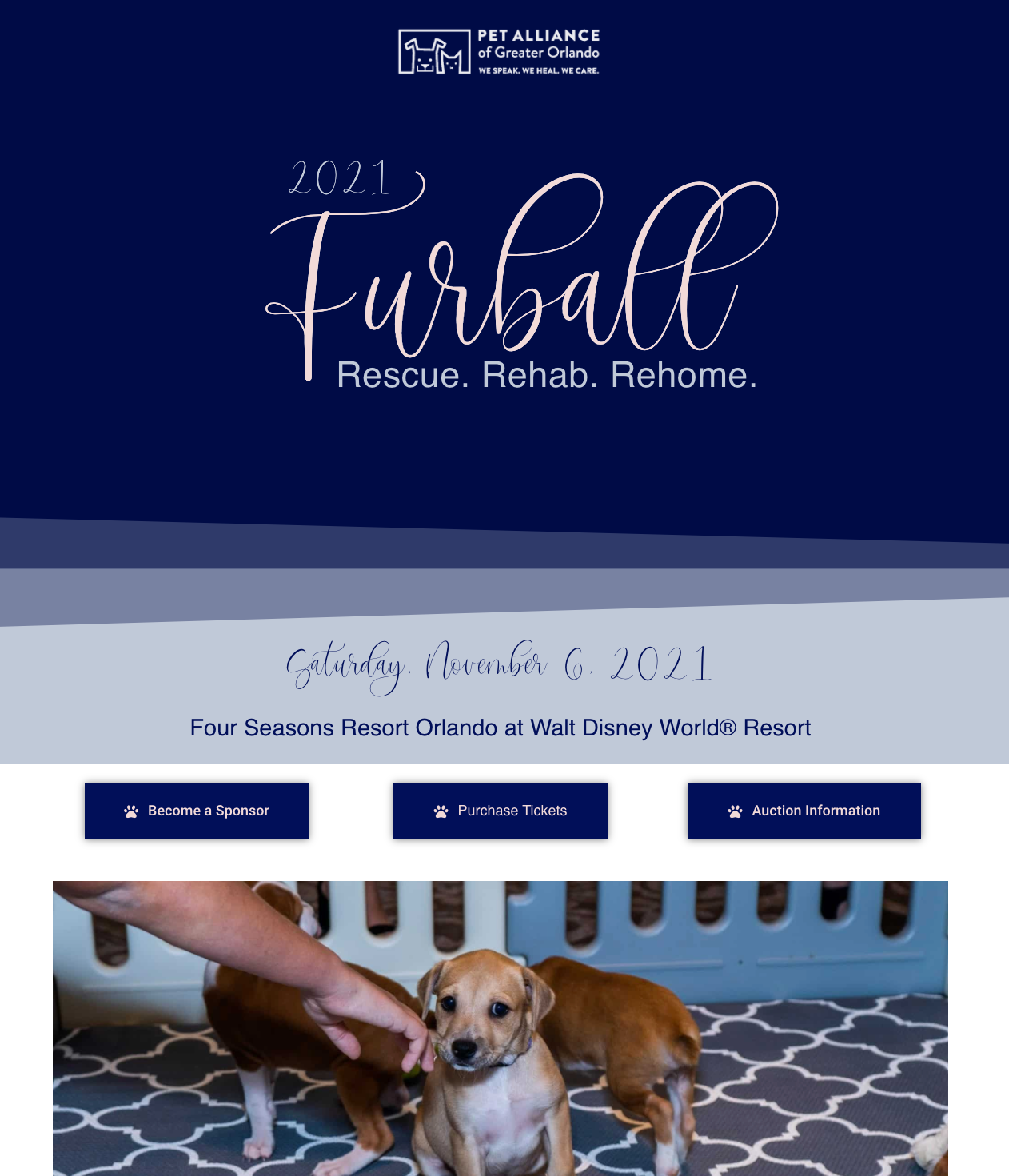 Furball, Pet Alliance of Greater Orlando's largest fundraiser of the year, takes place a the Four Season Resort. Opulent and adorable (there's a Cuddle Lounge with puppies & kittens) I was charged with creating and designing the ticketing website, sponsor packet, and print collateral for the event to recognize sponsors and promote auction items. I also created a media-rich presentation for the evening that implemented images, video, and animated graphics.
